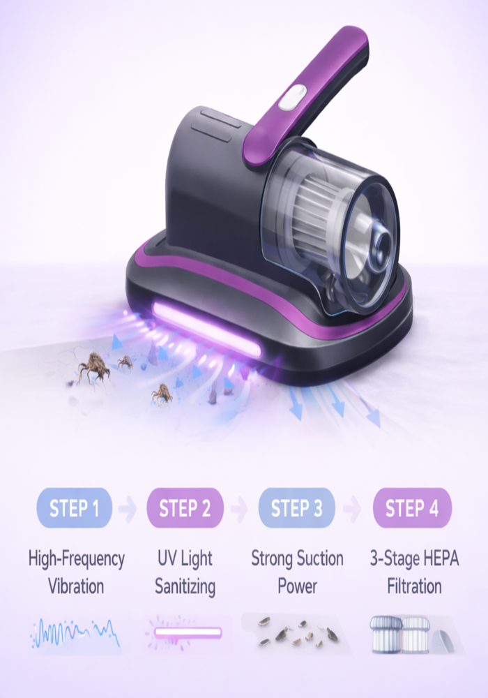 Step 1 — High-Frequency Vibration: The bottom brush rapidly taps the fabric (6,000 RPM), loosening deep dust, pet hair, and mites trapped inside mattresses and upholstery.